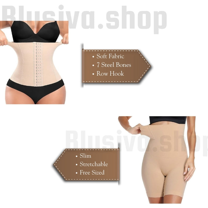 Step into absolute confidence with this 2-in-1 Shapewear Combo from Blusiva. Designed to sculpt, shape, and smooth, this bundle combines High Waist Tummy Control Shapewear Shorts for an invisible, natural-looking slim effect and a Waist Trainer Slim Belt for targeted tummy and thigh shaping with posture support. Together, they create the perfect blend of fashion, comfort, and body sculpting support for women who want to look sleek and unstoppable – anytime, anywhere!