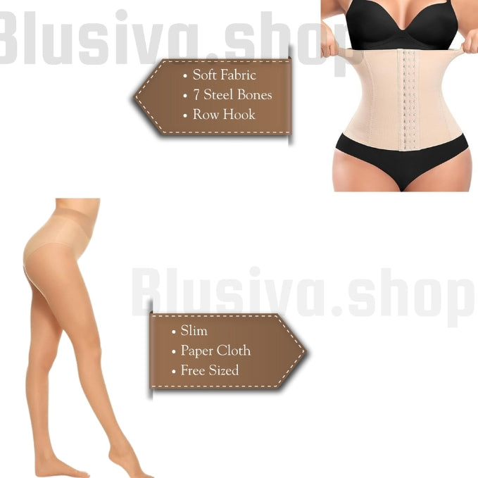 Upgrade your wardrobe with this exclusive 2-in-1 combo from Blusiva – combining sheer elegance with functional shaping. This pack includes Beige Sheer Pantyhose for a sleek, polished finish and a Beige Waist Trainer Slim Belt for powerful tummy & thigh sculpting. Together, they give you all-day comfort, style, and confidence.