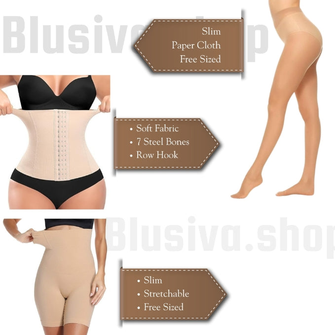 Includes: Pantyhose, Waist Trainer Slim Belt & High Waist Tummy Control Shapewear Shorts